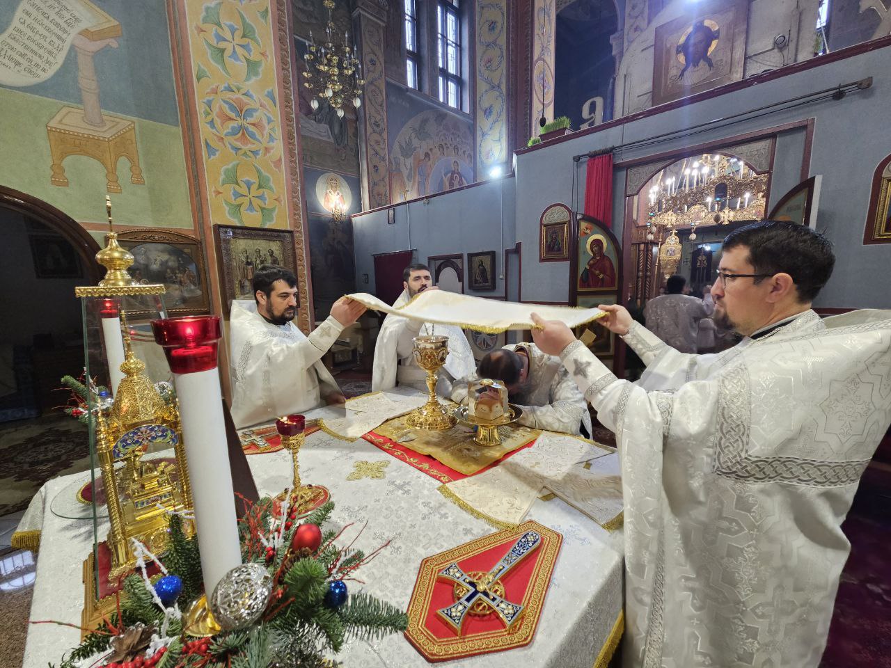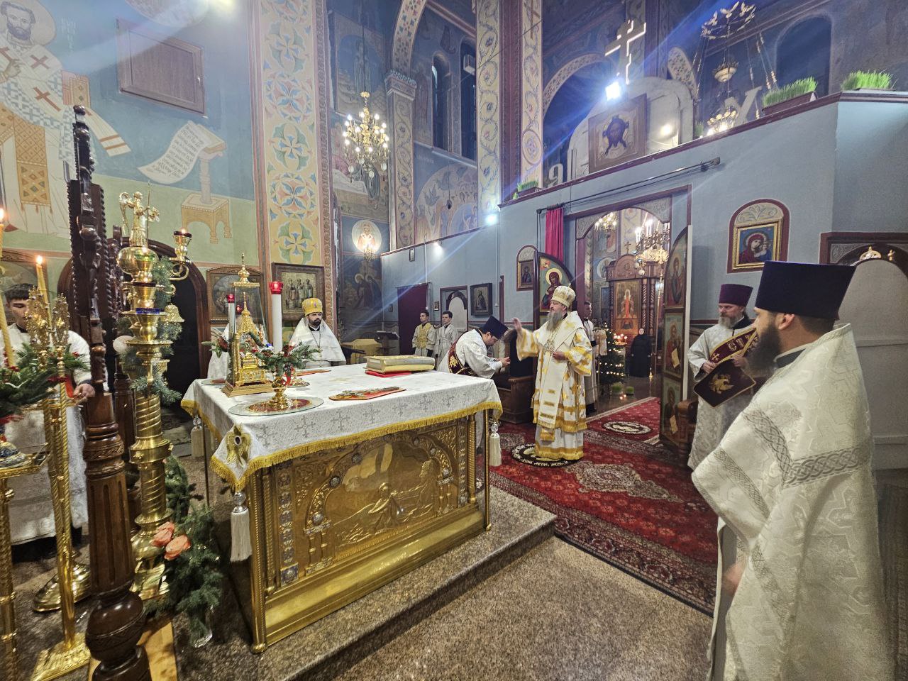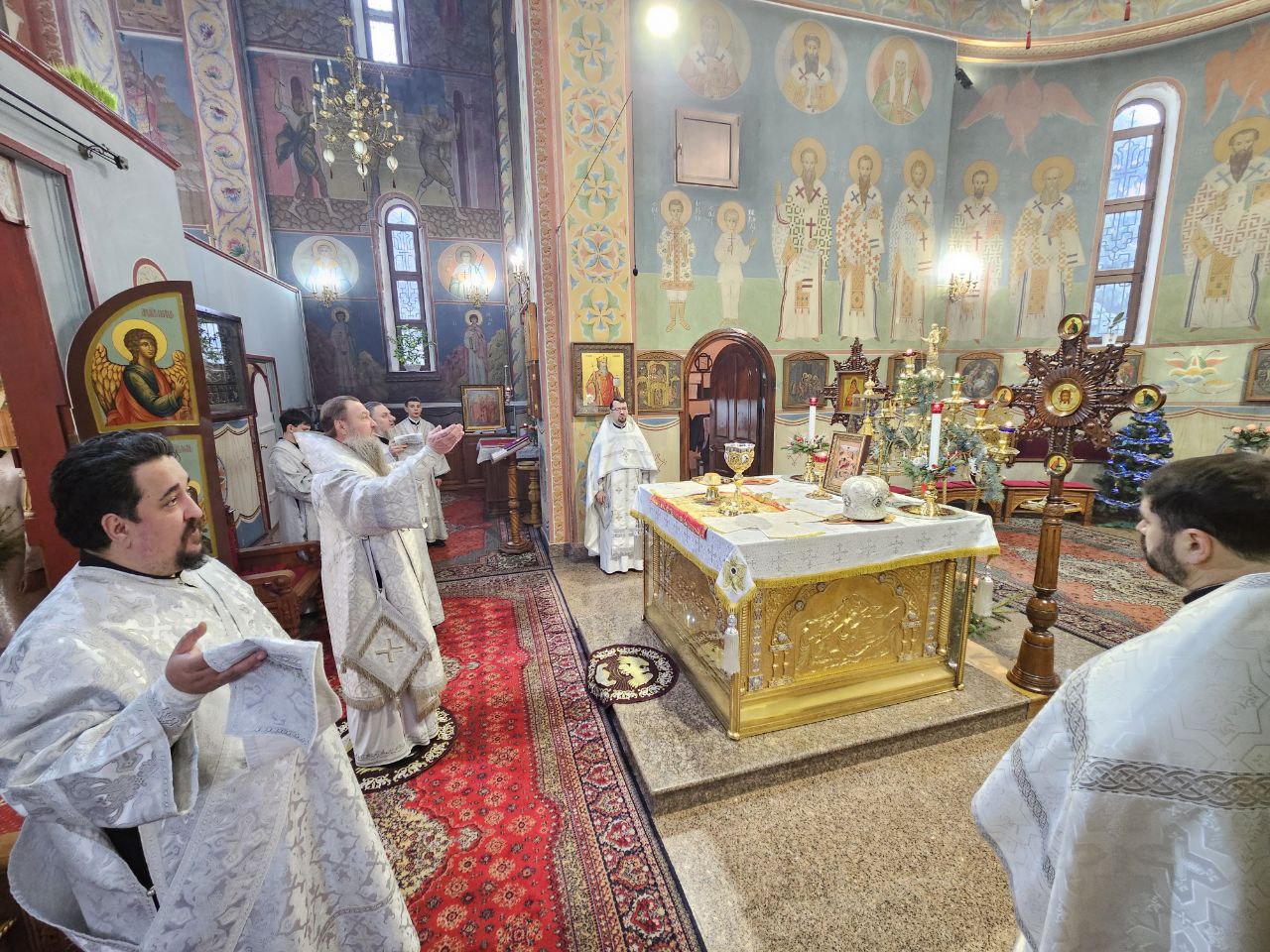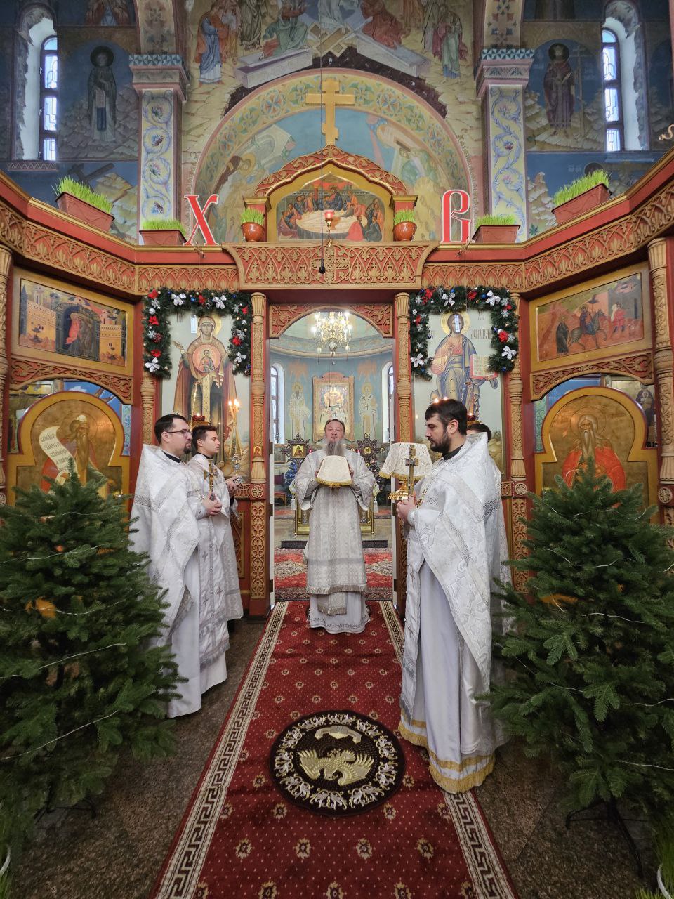 За богослужением Высокопреосвященнейшему Владыке настоятелю сослужили клирик прихода иеромонах Иоанн (Трайто) и клирик кафедрального собора Рождества Христова протодиакон Сергий Афтени. Совместная молитва духовенства и многочисленных прихожан стала духовным приготовлением к грядущему празднику Рождества Христова.