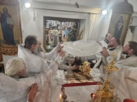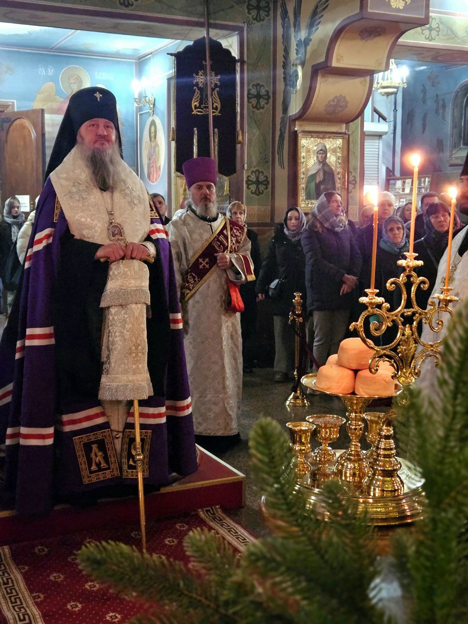 В завершение богослужения священнослужители во главе с Архиереем вышли к благолепно украшенной иконе праздника, где спели тропарь и кондак Рождества Христова. Затем Владыка освятил коливо – во укрепление телесных сил постящихся, так как по Уставу вкушать пищу разрешается уже после вечерни, которая в этот день совершается в соединении с литургией свт. Василия Великого.