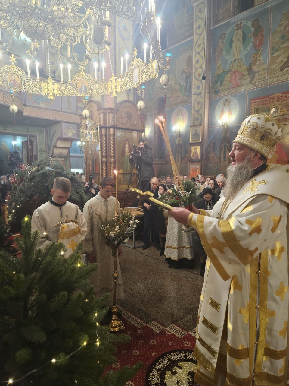 На полиелее Высокопреосвященнейший Владыка прочёл евангельский отрывок, повествующий о Рождестве Христовом (Мф. 1:18–25), после чего обратился к многочисленным молящимся со словами поздравления с наступающим праздником пришествия в мир Спасителя, явления миру Богочеловека Христа.