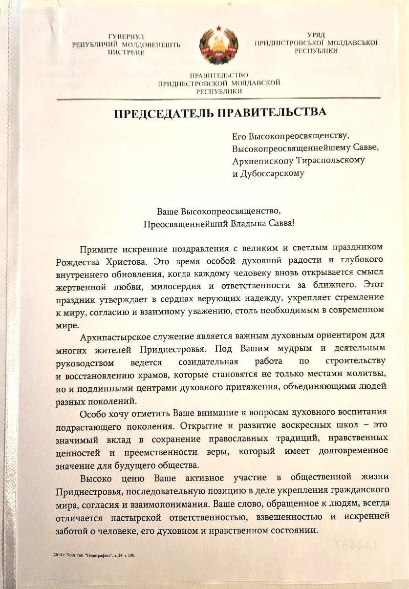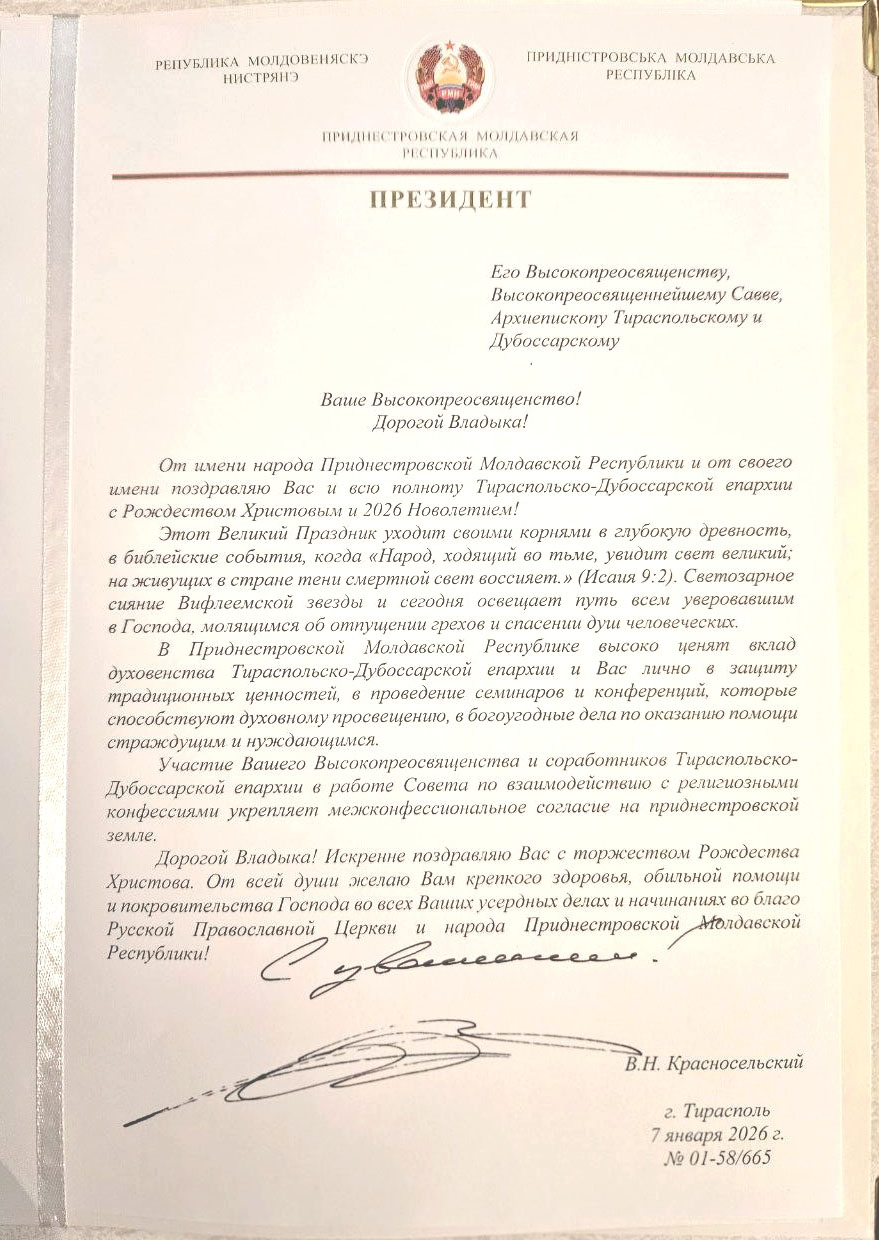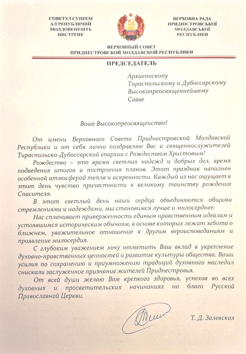 Ко дню светлого и спасительного праздника Рождества Господа Бога и Спаса нашего Иисуса Христа в адрес Управляющего Тираспольско-Дубоссарской епархией Его Высокопреосвященства архиепископа Саввы поступили поздравительные письма от Святейшего Патриарха Московского и всея Руси Кирилла, собратьев-архипастырей, а также первых лиц Приднестровской Молдавской Республики – Президента Вадима Николаевича Красносельского, Председателя Правительства Александра Николаевича Розенберга, Председателя Верховного Совета Татьяны Дмитриевны Залевской, руководителей органов государственной власти, министерств и ведомств, общественных организаций Приднестровья.