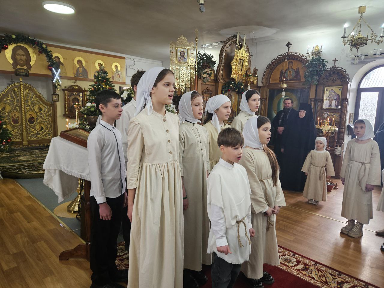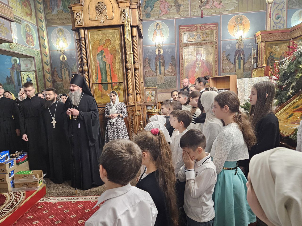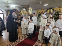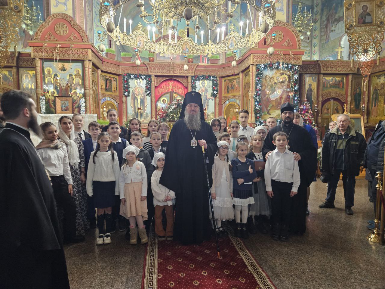 По завершении богослужения воспитанники воскресной школы кафедрального собора представили собравшимся рождественское представление. В исполнении детей прозвучали праздничные песнопения и стихотворения, а также были показаны сценки, повествующие о событиях святой Рождественской ночи, поклонении Богомладенцу и радости, которую принесло миру Его Рождение.