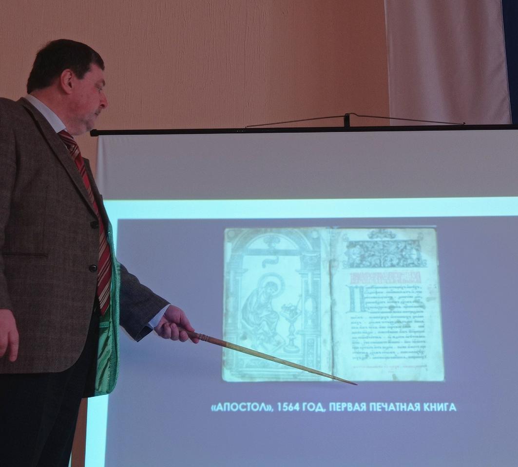 В ходе встречи Николай Викторович познакомил студентов с историей христианской литературы и основными этапами становления книгопечатания в России. Особое внимание было уделено первой русской печатной книге – «Апостолу», изданному 1 (14) марта 1564 года в типографии Ивана Фёдорова.