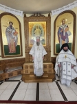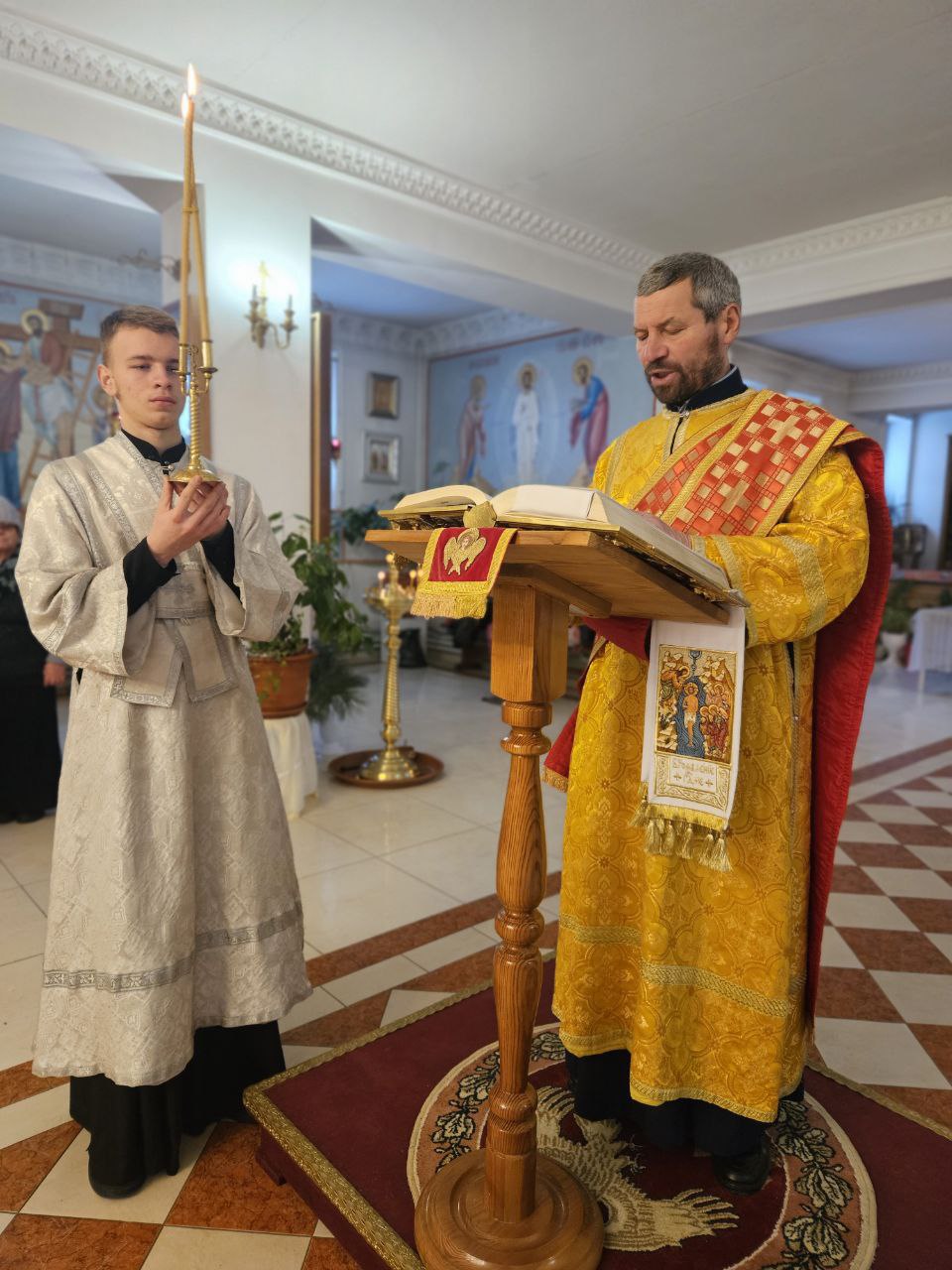 За богослужением Правящему Архиерею сослужили клирик прихода иеромонах Иоанн (Трайто) и клирик кафедрального собора Рождества Христова диакон Геннадий Гнатюк. В храме молились многочисленные прихожане, собравшиеся для совместной молитвы в воскресный день в преддверии одного из двунадесятых праздников Церкви.