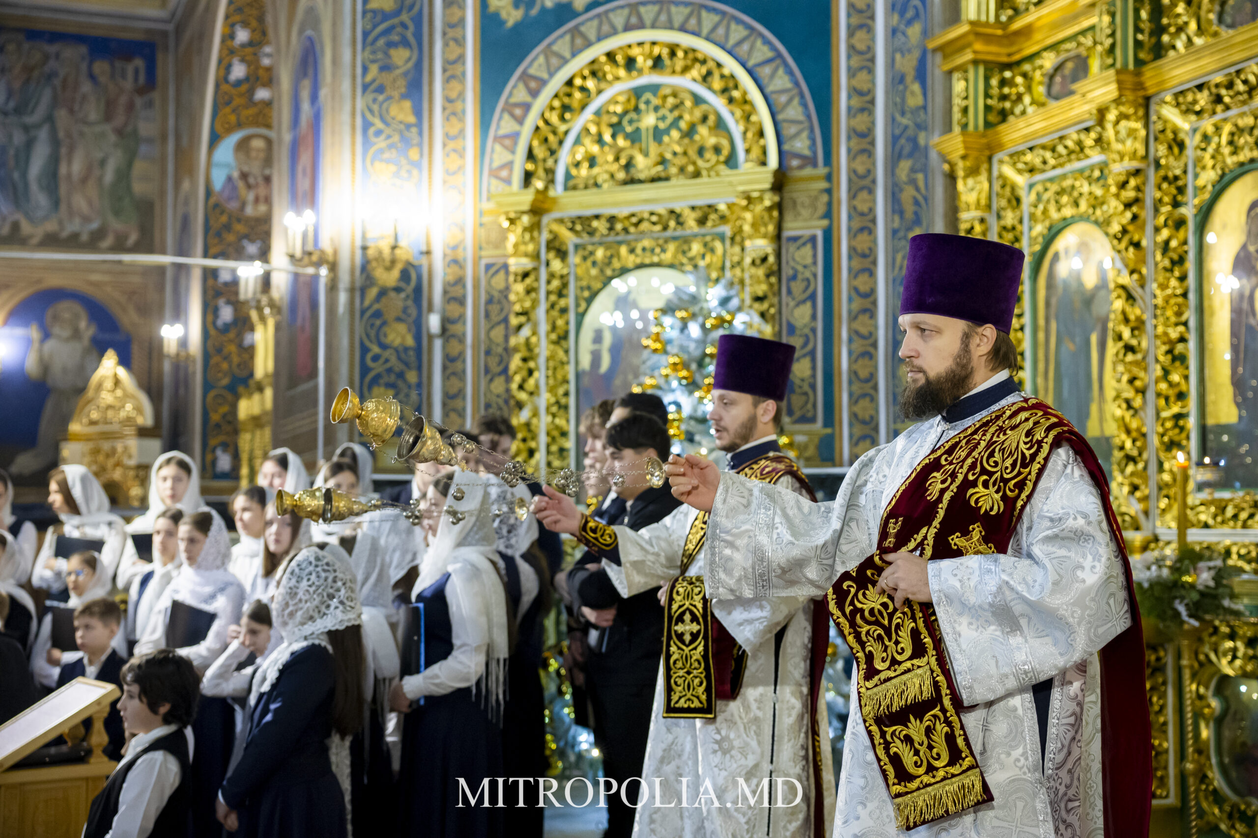 За богослужением Высокопреосвященнейшему Владыке настоятелю сослужили клирик прихода иеромонах Иоанн (Трайто) и клирик кафедрального собора Рождества Христова протодиакон Сергий Афтени. Совместная молитва духовенства и многочисленных прихожан стала духовным приготовлением к грядущему празднику Рождества Христова.