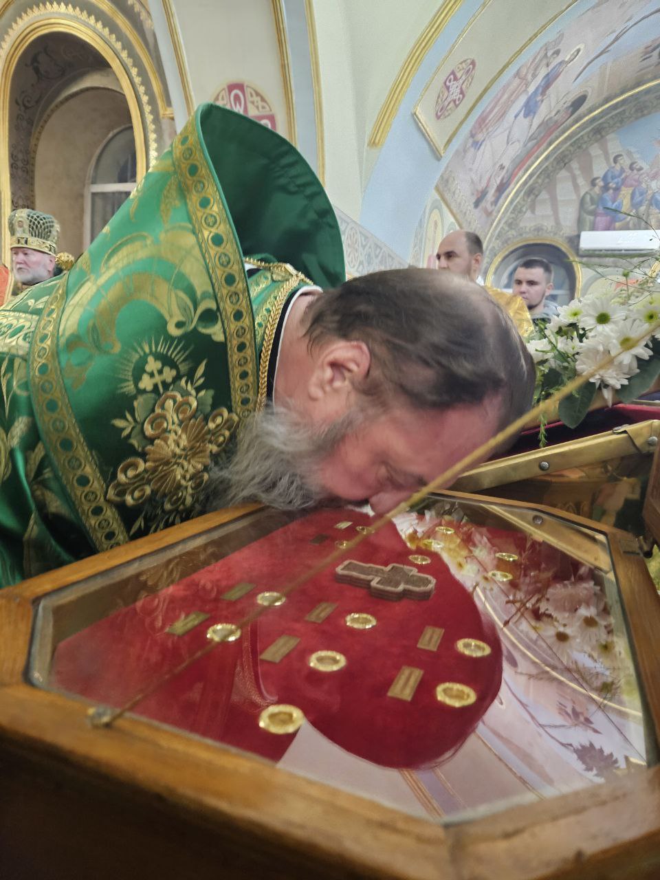 За богослужением в большом числе собравшиеся верующие с благоговением прикладывались к великой святыне, доставленной в собор к празднику, – ковчегу с частицами мощей угодников Божиих преподобных Серафима Саровского, Иова и Амфилохия Почаевских, Ионы Одесского, Илии Муромца, Тимона Надеевского, Гавриила Афонского и других афонских старцев, а также благоверных князей Феодора Ярославского и Романа Угличского.
