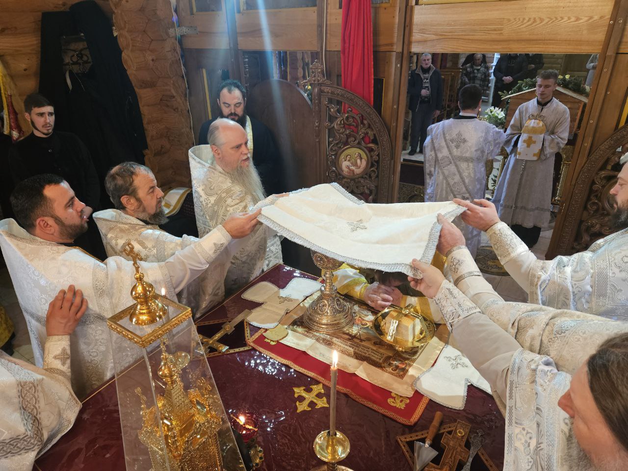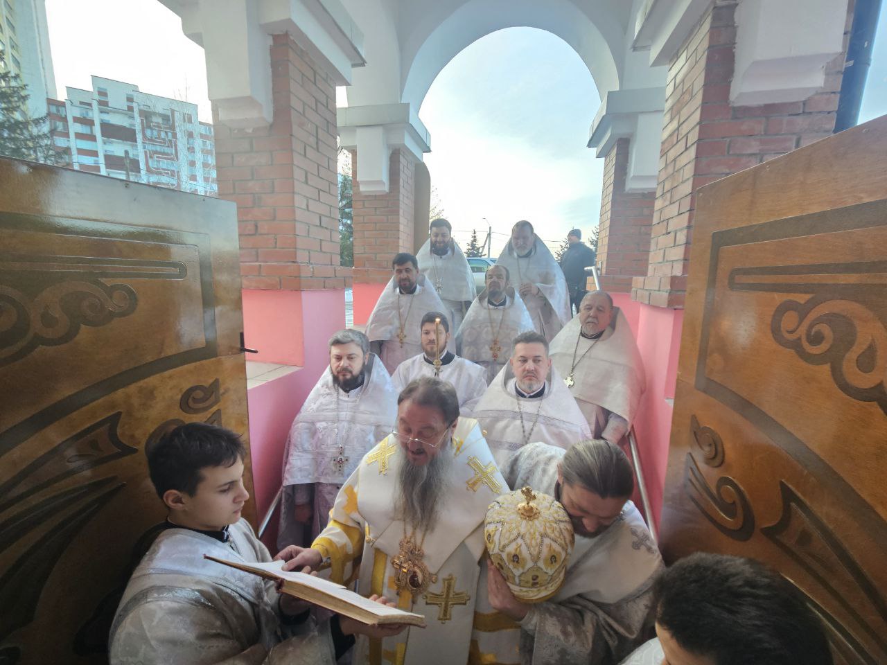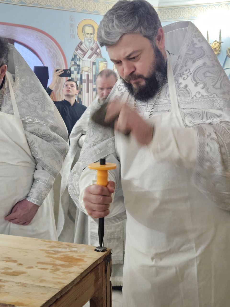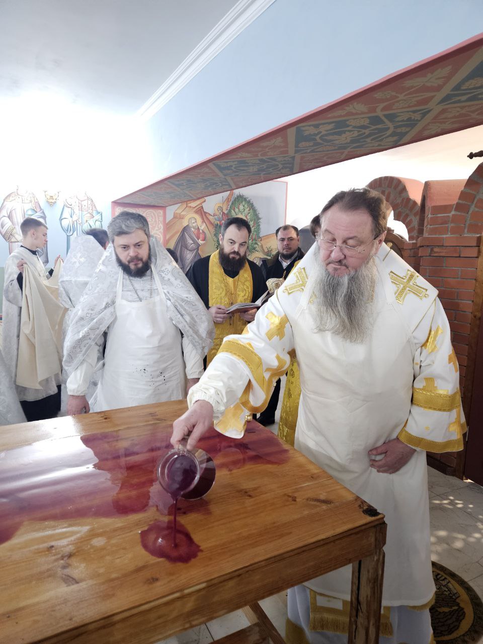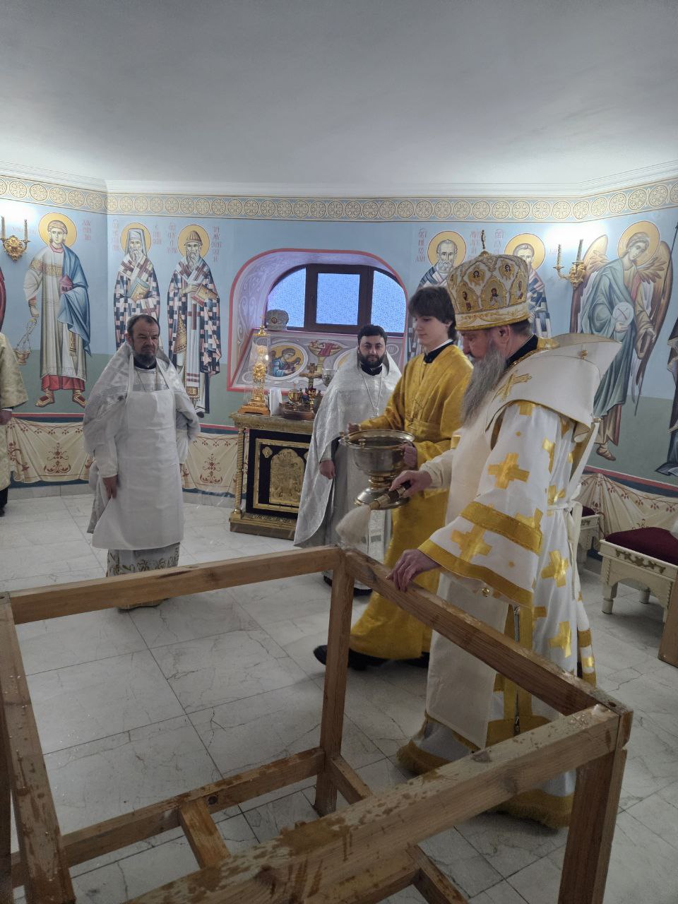Перед началом Божественной литургии, в ознаменование окончания проводившихся последние месяцы ремонтно-восстановительных работ, Его Высокопреосвященством был совершён чин великого освящения храма во имя преподобного Маркелла, игумена обители «Неусыпающих», после завершения которого началось служение Божественной литургии.