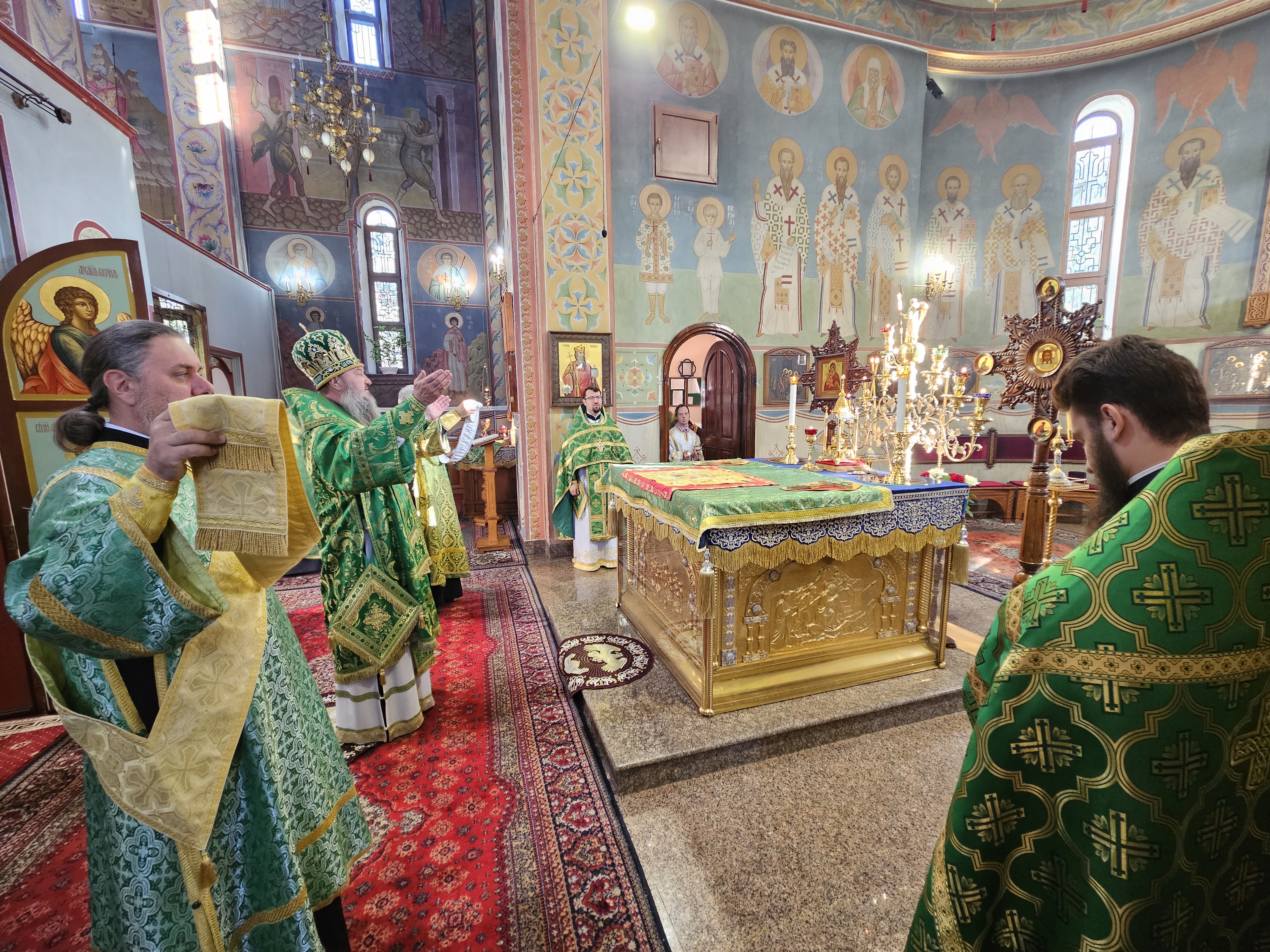 По отпусте литургии было совершено славление пред святыми и многоцелебными мощами угодника Божия святителя Дионисия, отошедшего ко Господу 17 сентября 1943 года и прославленного в лике святых решением Священного Синода Румынской Православной Церкви от 25 октября 2018 года.