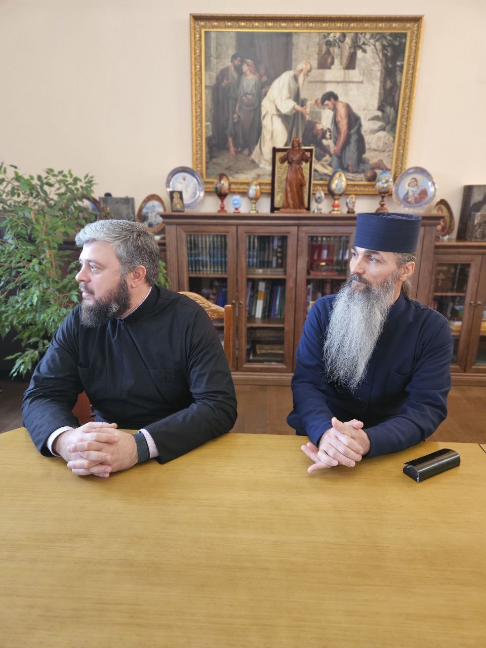 В завершение встречи советник Владыки Н. В. Дымченко, по поручению заслуженного художника ПМР В. Я. Завьялова, жителя Рыбницы, поздравил архиепископа с наступающей важной датой – 30-летием архиерейской хиротонии – и передал Владыке в дар три картины художника на церковную тематику.