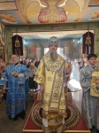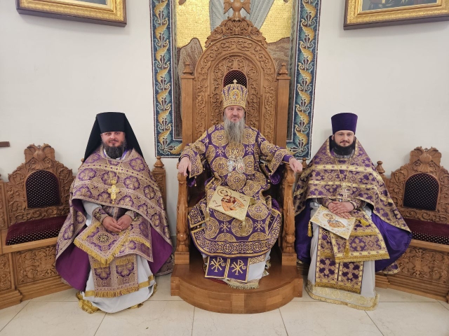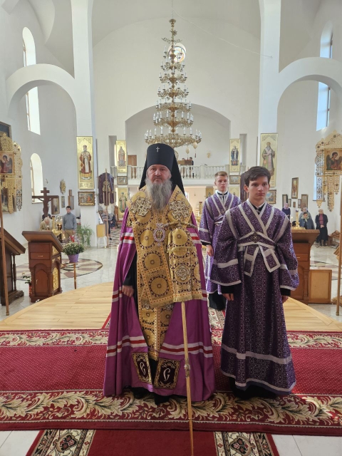 Его Высокопреосвященству сослужили ключарь собора протоиерей Павел Кузменых, клирики собора: протоиерей Георгий Скобиль, диакон Геннадий Гнатюк и проходящий богослужебную практику иеродиакон Никанор (Цверкун).