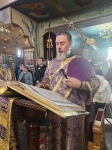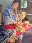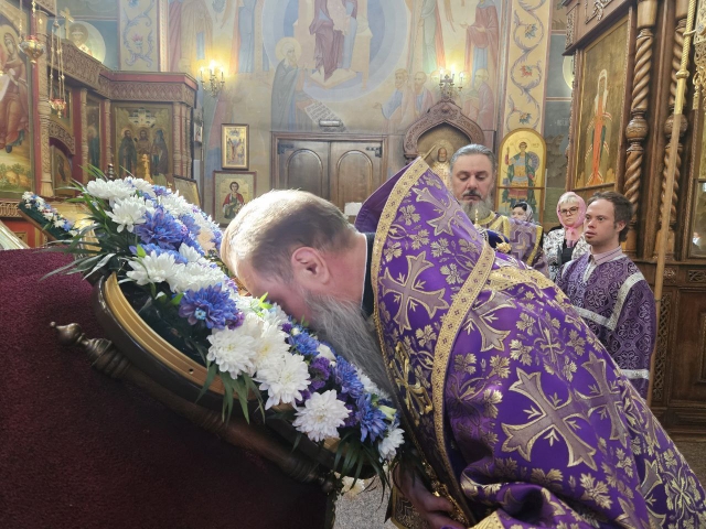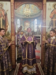 После великого славословия, Владыка Савва со служащим духовенством, совершил изнесение из Алтаря, украшенного живыми цветами Честнаго и Животворящего Креста Господня. При пении тропаря «Кресту Твоему поклоняемся, Владыко, и святое воскресение Твое славим», духовенство и миряне троекратно поклонились Святому Кресту, после чего, Правящий Архиерей помазал причт и прихожан освященным иелеем.