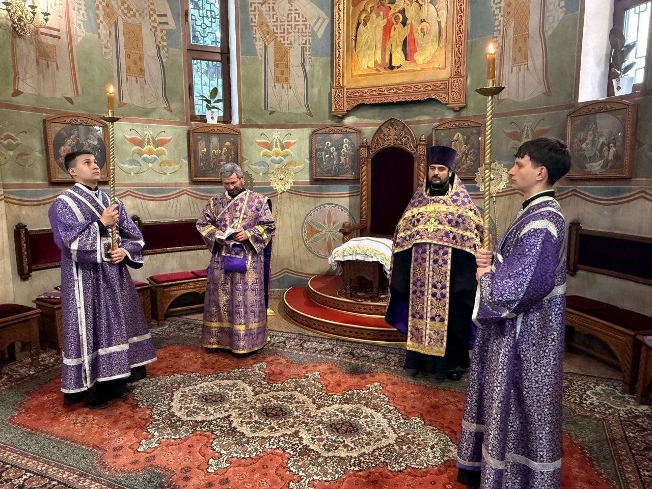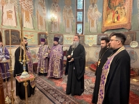 За Литургией Преждеосвященных Даров Правящему Архиерею сослужили клирики Свято-Введенско-Пахомиева монастыря, Воздвиженского прихода и кафедрального собора Рождества Христова протоиерей Анатолий Каушан, иеромонахи Иоанн (Трайто) и Симеон (Лупашко), протодиакон Сергий Афтени.