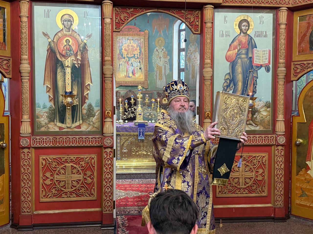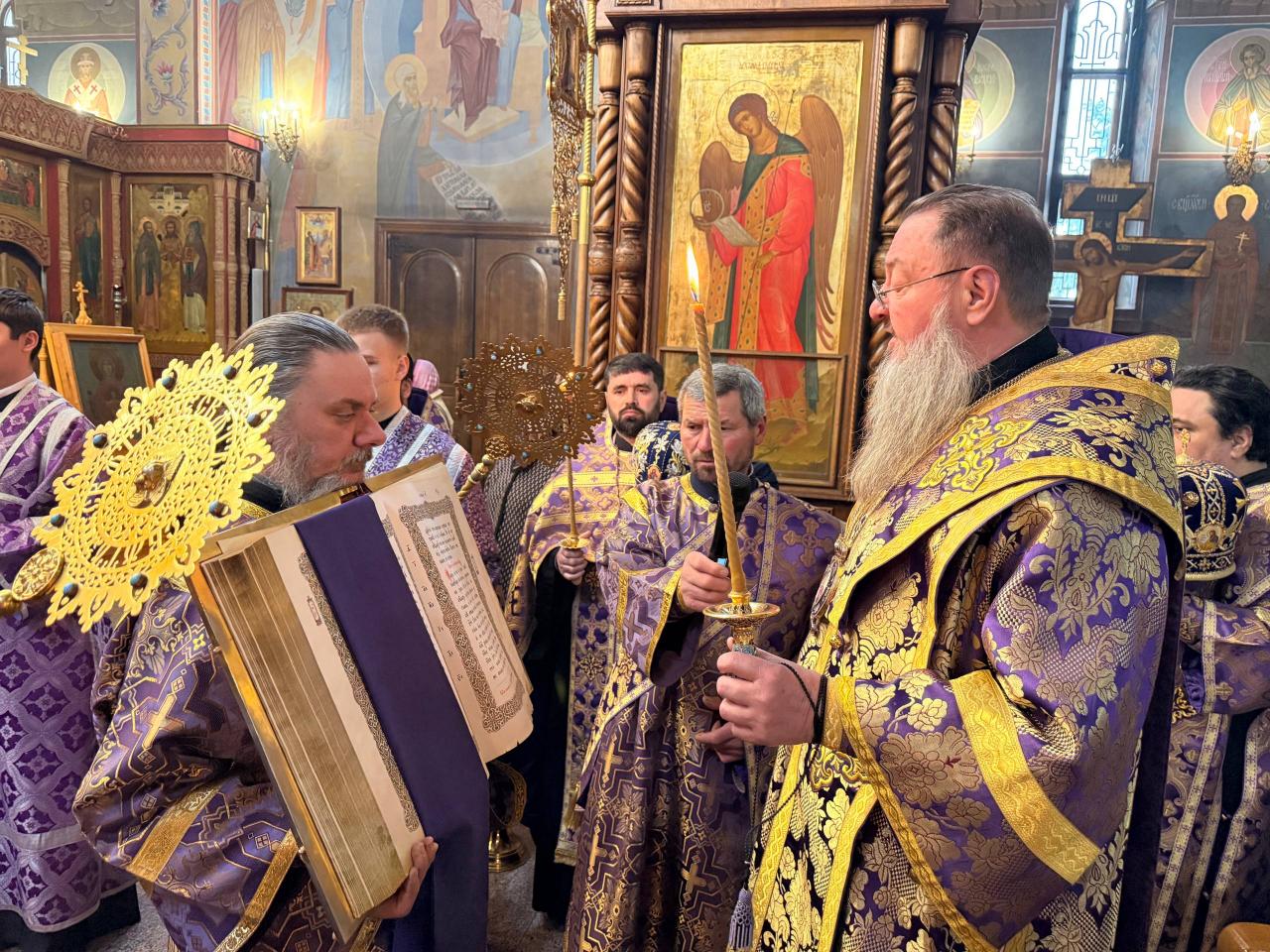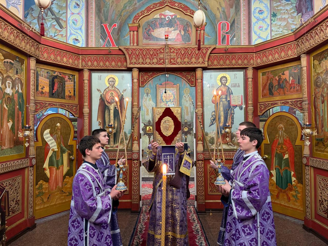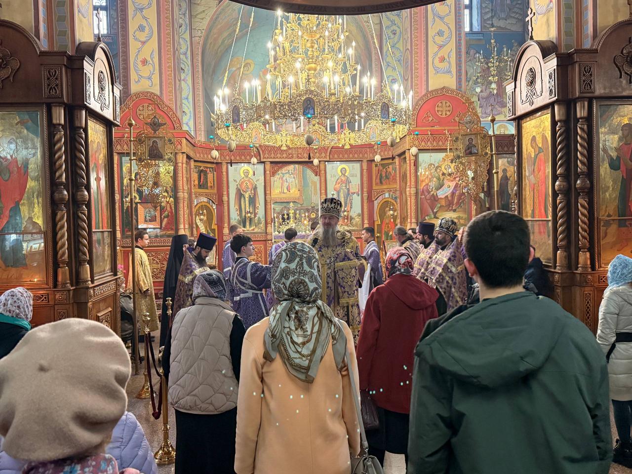 За богослужением Правящему Архиерею сослужили ключарь и клирики кафедрального собора. Вместе с духовенством и прихожанами Владыка вознёс молитвы, готовя верующих к празднованию Крестопоклонной недели, которая занимает особое место в середине Святой Четыредесятницы.