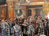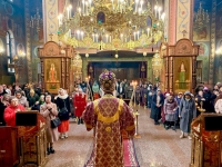 Его Высокопреосвященству сослужили клирики прихода и кафедрального собора Рождества Христова иеромонахи Иоанн (Трайто), Симеон (Лупашко) и протодиакон Сергий Афтени. За богослужением молились прихожане, собравшиеся для совместной молитвы в начале Страстно́й седмицы.