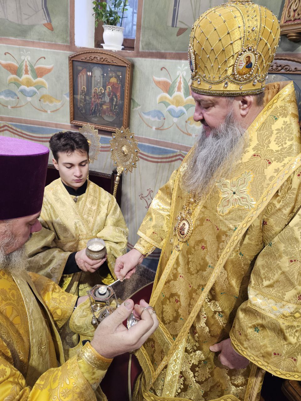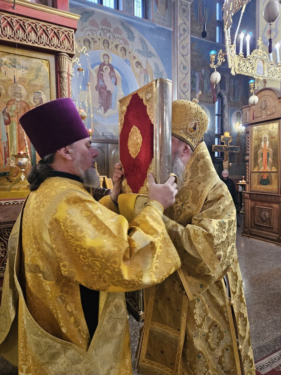 За богослужением Высокопреосвященнейшему Владыке настоятелю сослужили клирики кафедрального собора.