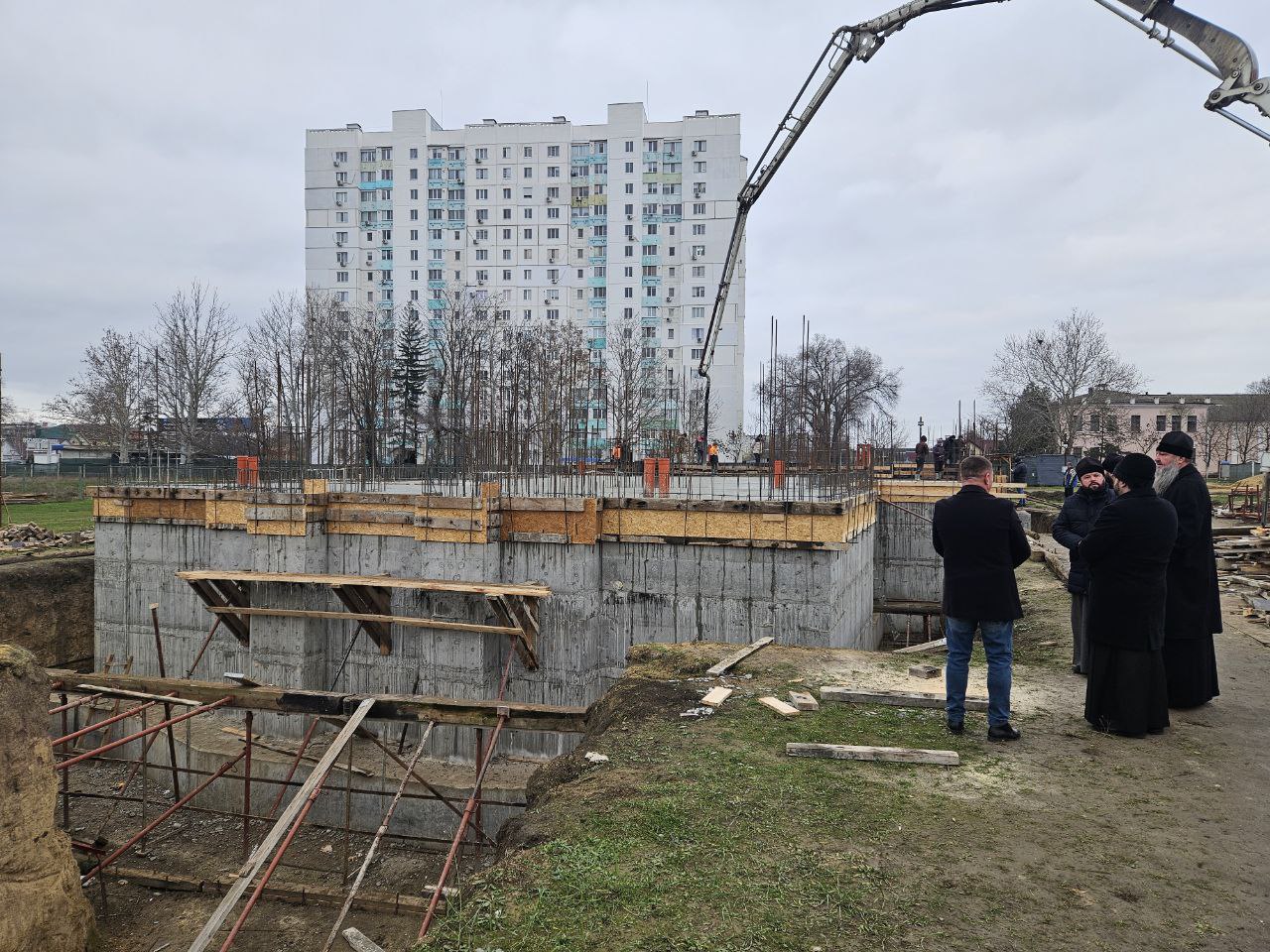 К настоящему времени на строительной площадке завершены работы по заливке фундамента и идёт подготовка к следующему этапу – возведению стен храма, – который планируется начать в новом году.