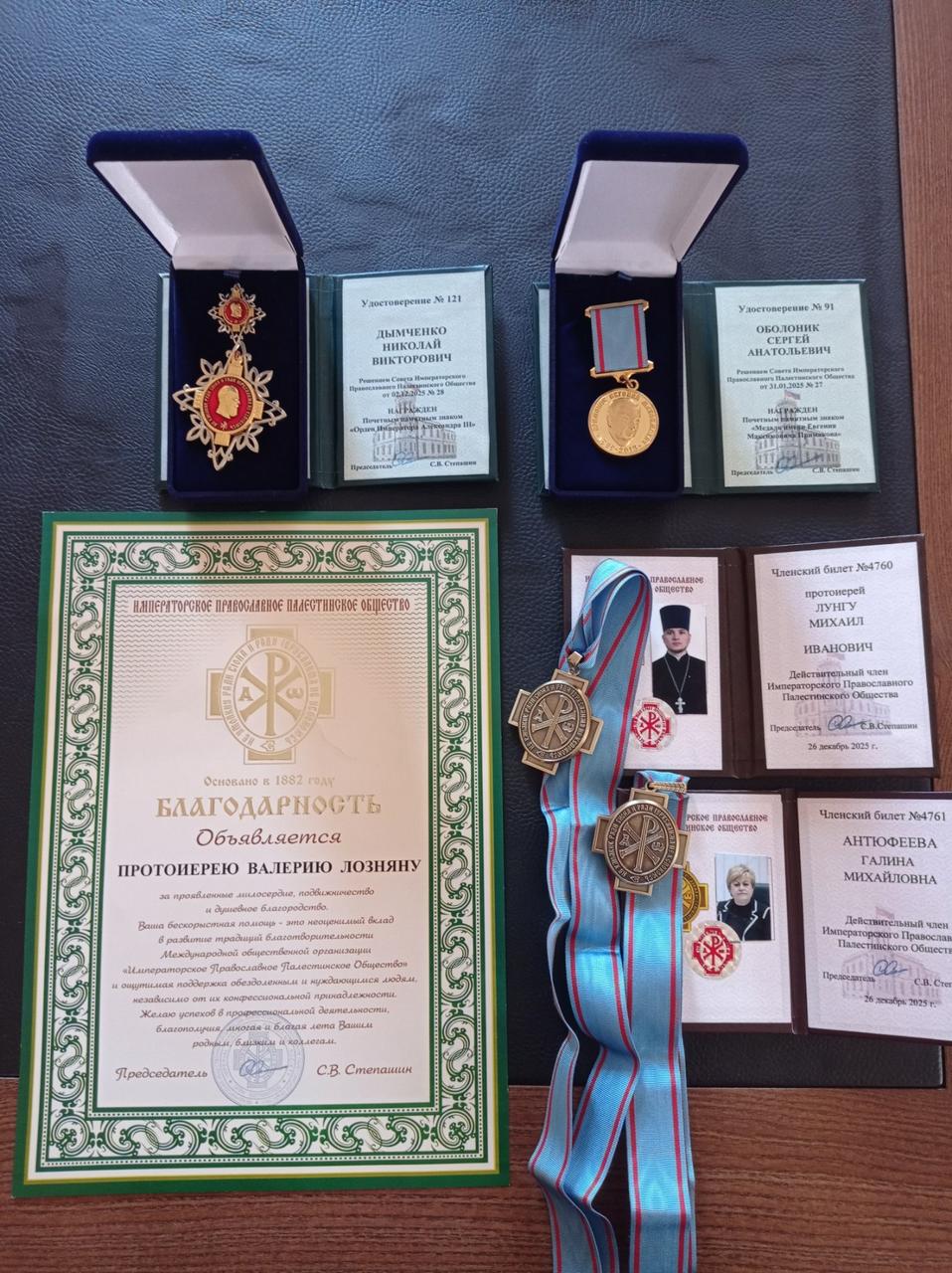 В ходе заседания также были вручены награды Императорского Православного Палестинского Общества. Медалью имени Е. М. Примакова за развитие церковно-государственного взаимодействия и содействие церковному строительству был отмечен С. А. Оболоник. Почётным знаком имени императора Александра III за труды по сохранению историко-культурного наследия и в связи с юбилеем награждён Н. В. Дымченко. Благодарности председателя ИППО С. В. Степашина за плодотворную работу по сотрудничеству Церкви и армии удостоился протоиерей Валерий Лознян.