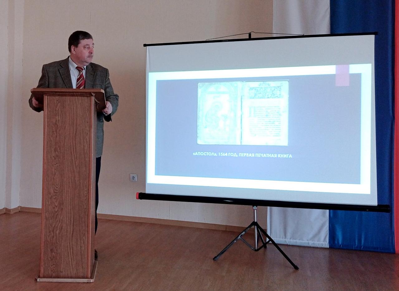 В ходе встречи Николай Викторович познакомил студентов с историей христианской литературы и основными этапами становления книгопечатания в России. Особое внимание было уделено первой русской печатной книге – «Апостолу», изданному 1 (14) марта 1564 года в типографии Ивана Фёдорова.