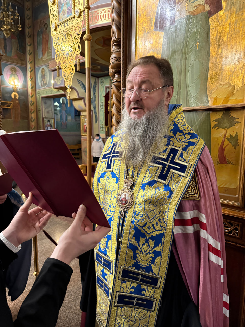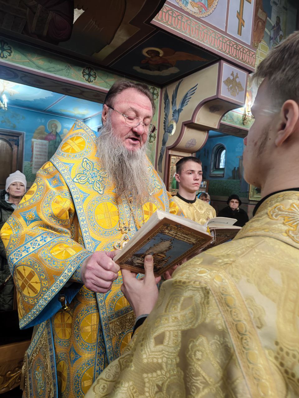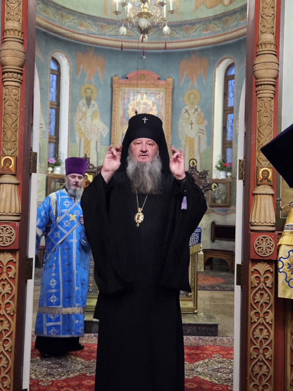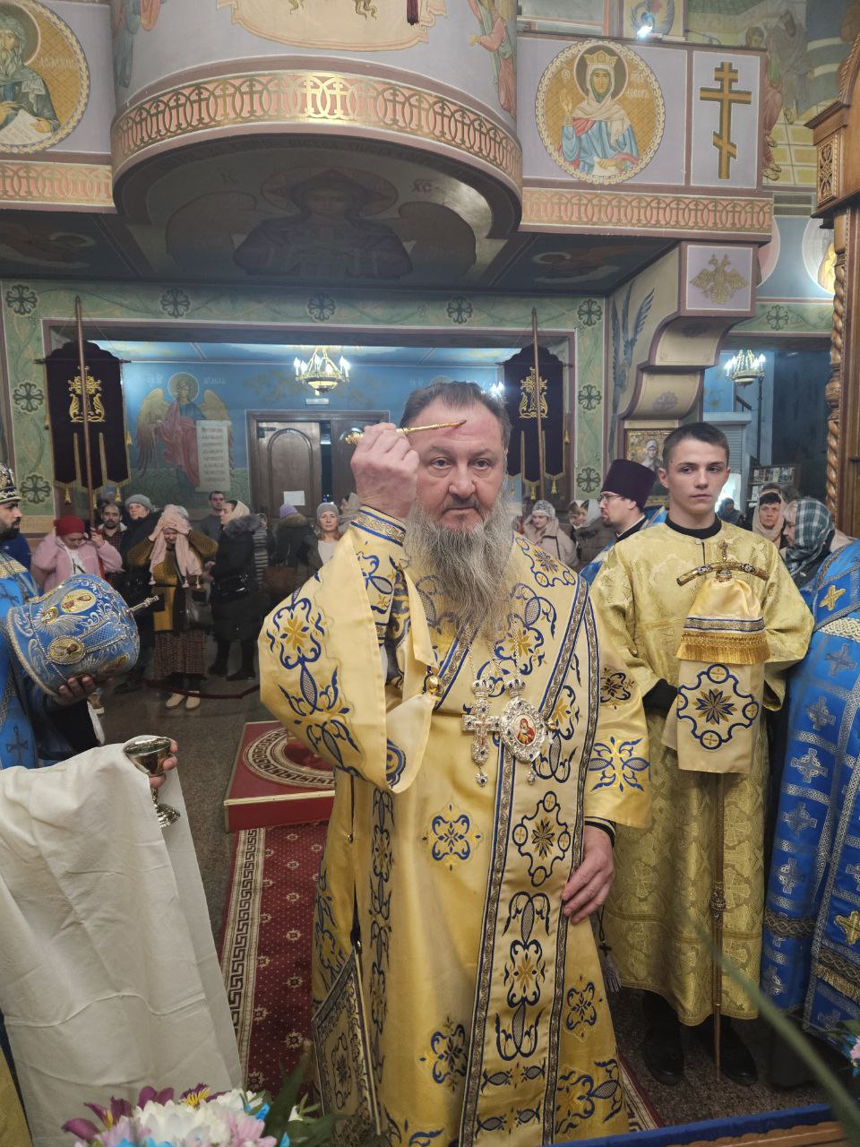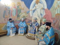 Его Высокопреосвященству сослужили секретарь епархии протоиерей Иоанн Калмык, ключарь кафедрального собора Рождества Христова протоиерей Павел Кузменых, клирики Введенско-Пахомиева монастыря протоиерей Анатолий Каушан и иерей Сергий Грозовский, клирик кафедрального собора Рождества Христова протодиакон Сергий Афтени.