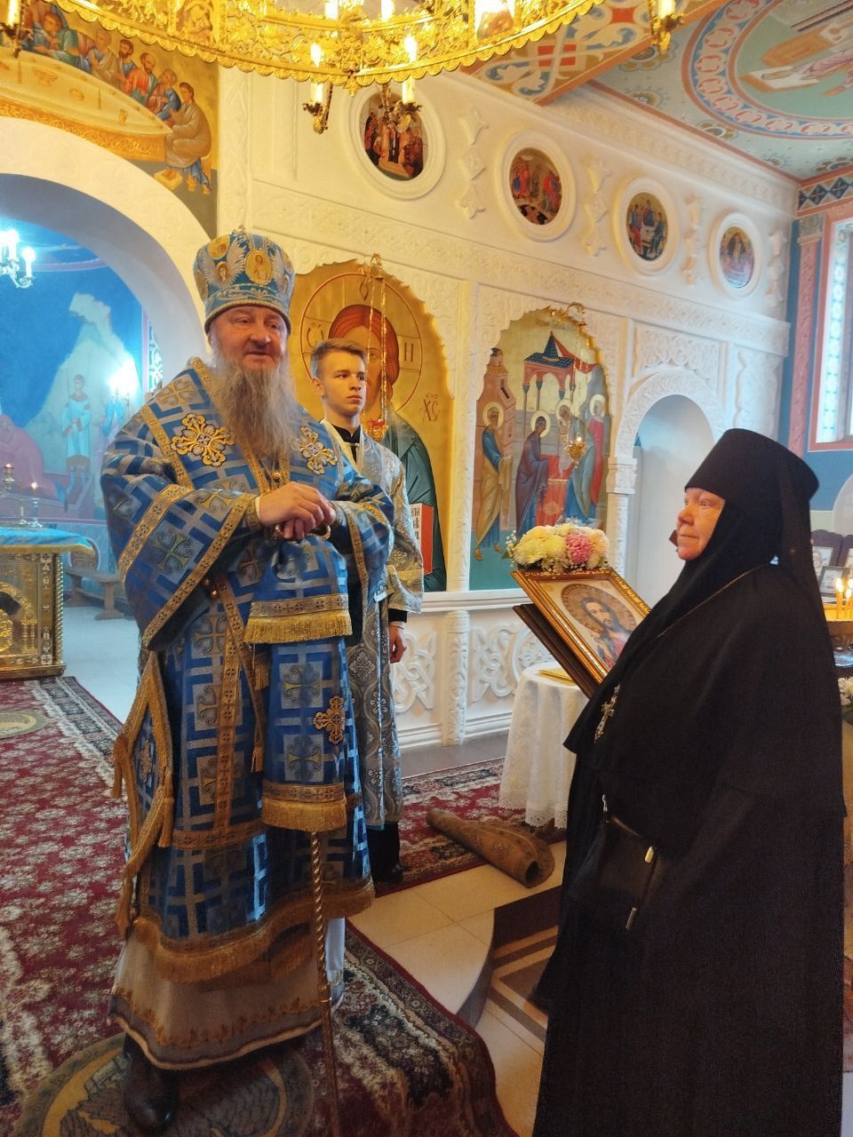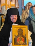 Игумения Пахомия выразила Правящему Архиерею благодарность за молитвенное участие в праздничных торжествах и преподнесла Владыке икону Божией Матери «Знамение», празднество в честь которой совершается 10 декабря.