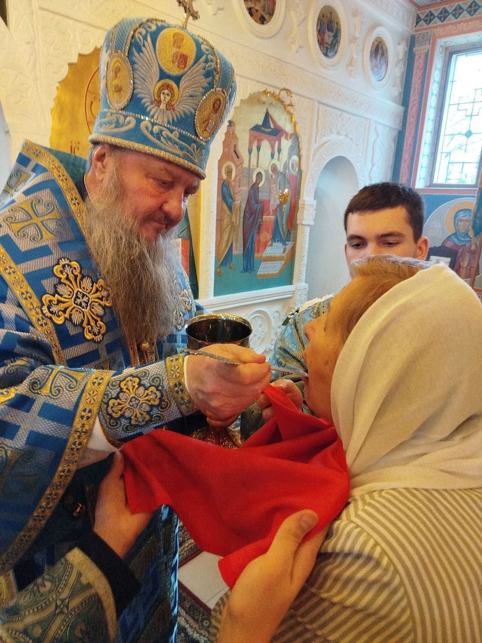 На полиелее Архипастырь прочёл отрывок из Святого Евангелия, читаемый за вечерним богослужением на праздники в честь Божией Матери (Лк. 1:39–49, 56). По полиелее Его Высокопреосвященство обратился к прихожанам, поздравив их с наступающим праздником, после чего помазал святым елеем духовенство и мирян.