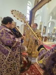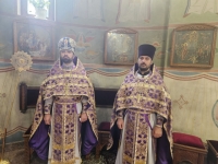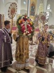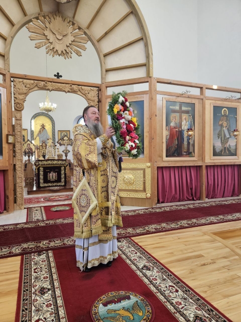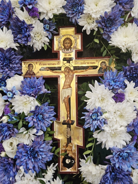 После великого славословия, Владыка Савва со служащим духовенством, совершил изнесение из Алтаря, украшенного живыми цветами Честнаго и Животворящего Креста Господня. При пении тропаря «Кресту Твоему поклоняемся, Владыко, и святое воскресение Твое славим», духовенство и миряне троекратно поклонились Святому Кресту, после чего, Правящий Архиерей помазал причт и прихожан освященным иелеем.