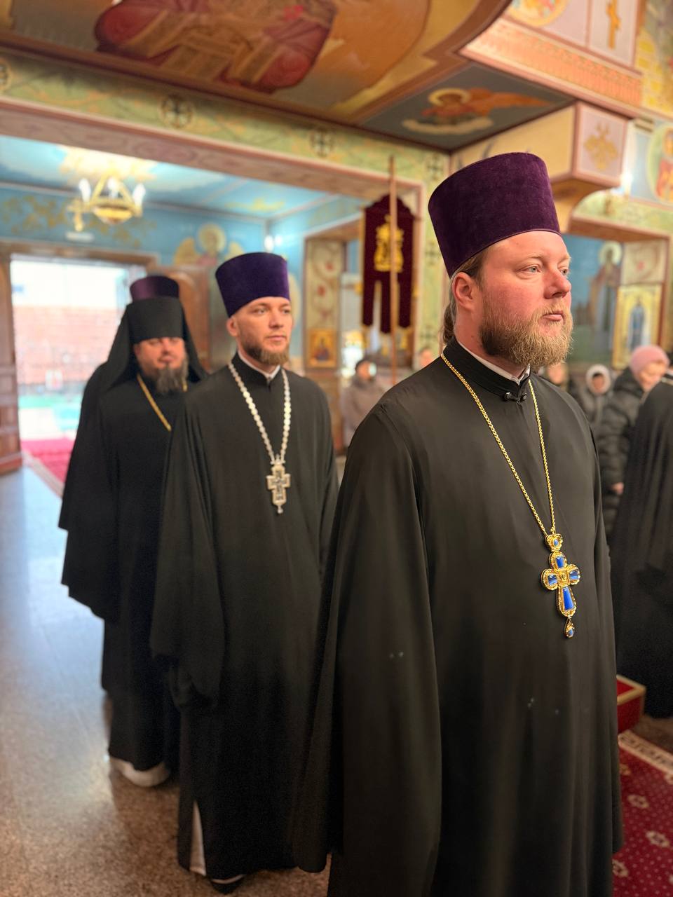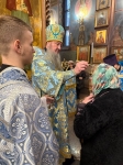 Затем Правящий Архиерей обратился к духовенству и прихожанам с архипастырским словом, поздравив собравшихся с наступающим воскресным днём и праздником Сретения Господня, напомнив о глубоком духовном смысле этого события как встречи человека с Богом, призывающей каждого христианина к внутреннему обновлению и живой вере. По окончании слова Владыка помазал святым елеем духовенство и мирян.