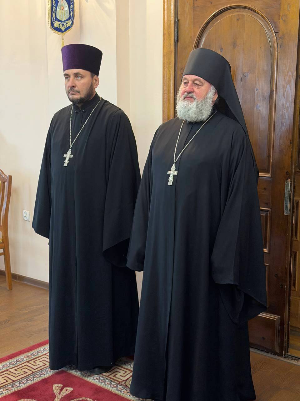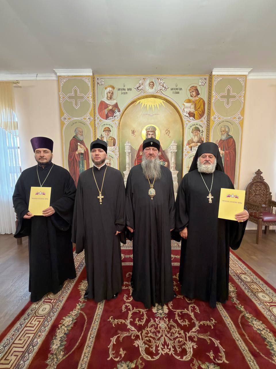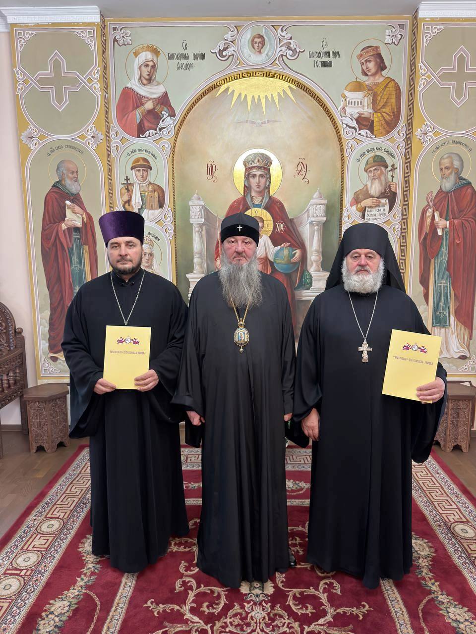 Вручение указов 18.11.202518 ноября Его Высокопреосвященство архиепископ Тираспольский и Дубоссарский Савва принял в рабочем кабинете благочинного Бендерского округа, настоятеля храма блгв. кн. Александра Невского в Бен­дерской крепости протоиерея Михаила Лунгу и окончивших прохождение богослужебной практики иерея Романа Казанцева и иеромонаха Никанора (Цверкуна). Управляющий епархией вручил данным клирикам указы о назначении в штат Александро-Невского прихода и преподал архипастырское благословение на неленостные труды в новом для себя звании.