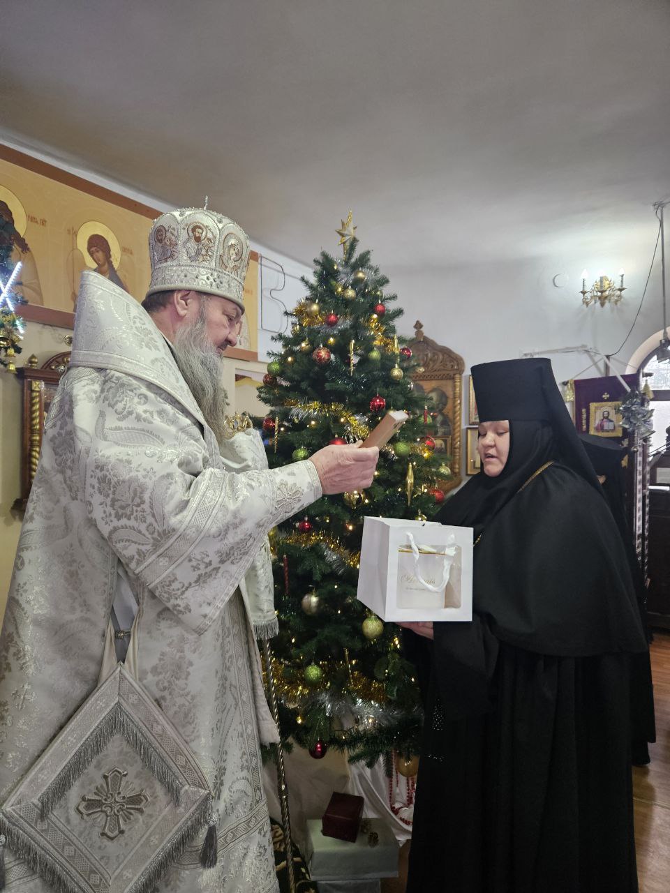 По завершении архиерейского слова воспитанники воскресной школы при монастыре представили Владыке, матушке игумении, сестрам обители и гостям рождественское выступление. Высокопреосвященнейший Владыка Савва тепло поблагодарил детей за старание, обратился к ним с назидательным словом и вручил каждому ребенку рождественский подарок, благословив их на дальнейший духовный рост и укрепление в вере.