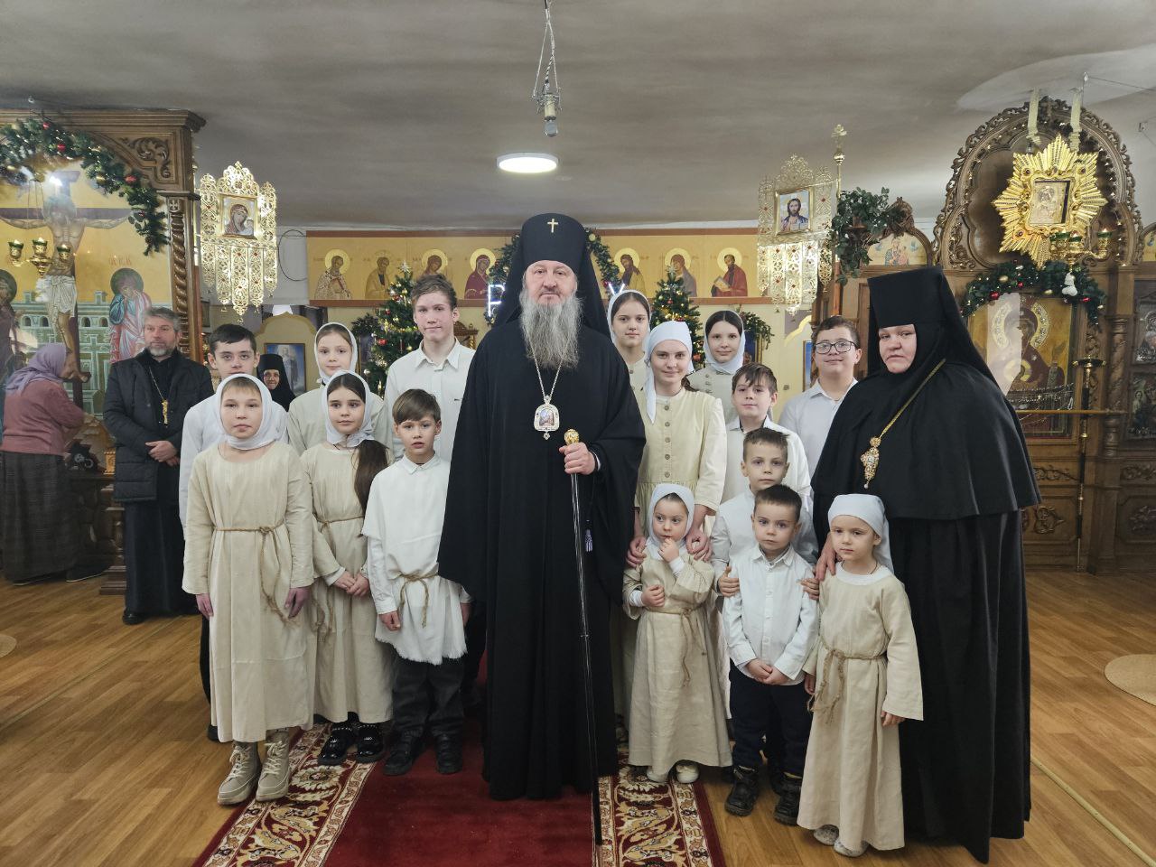 По завершении богослужения воспитанники воскресной школы кафедрального собора представили собравшимся рождественское представление. В исполнении детей прозвучали праздничные песнопения и стихотворения, а также были показаны сценки, повествующие о событиях святой Рождественской ночи, поклонении Богомладенцу и радости, которую принесло миру Его Рождение.
