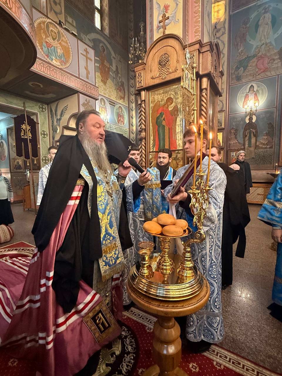 В ходе Всенощного бдения была совершена лития с освящением хлебов, пшеницы, вина и елея – как знамения благодарения Богу и прошения о ниспослании духовной и телесной помощи молящимся. После чтения Святого Евангелия архиепископ Савва совершил чин освящения свечей, именуемых в церковной традиции сретенскими.