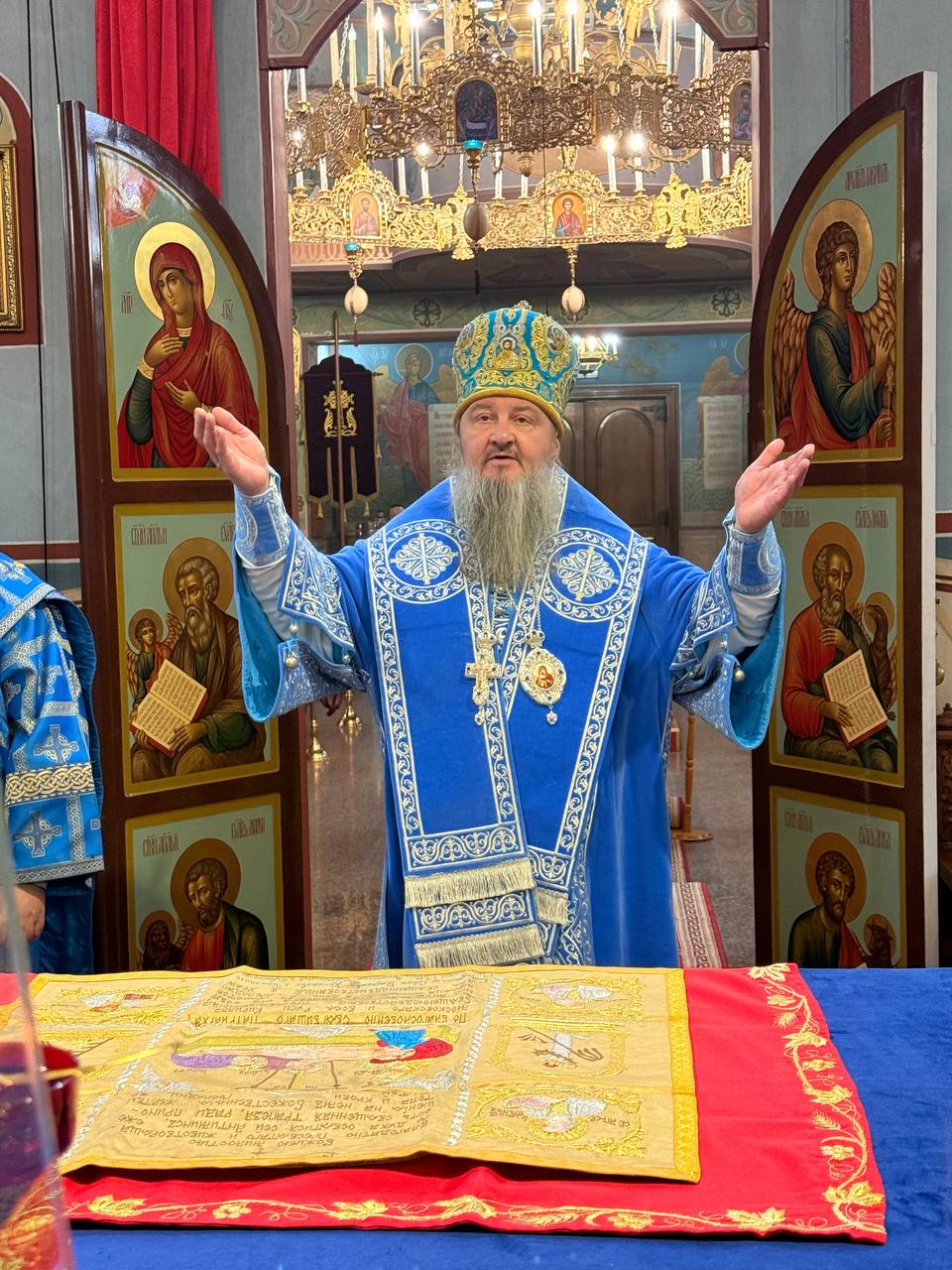 Затем Правящий Архиерей обратился к молящимся с архипастырской проповедью, в которой напомнил о материнской любви Божией Матери к каждому человеку, о необходимости покаяния и упования на милосердие Божие, а также призвал верующих с доверием вручать свою жизнь, скорби и надежды предстательству Пресвятой Богородицы.