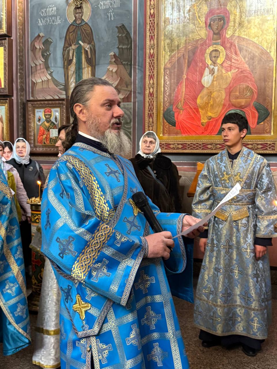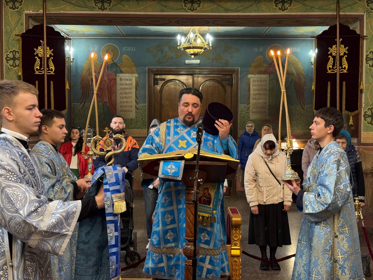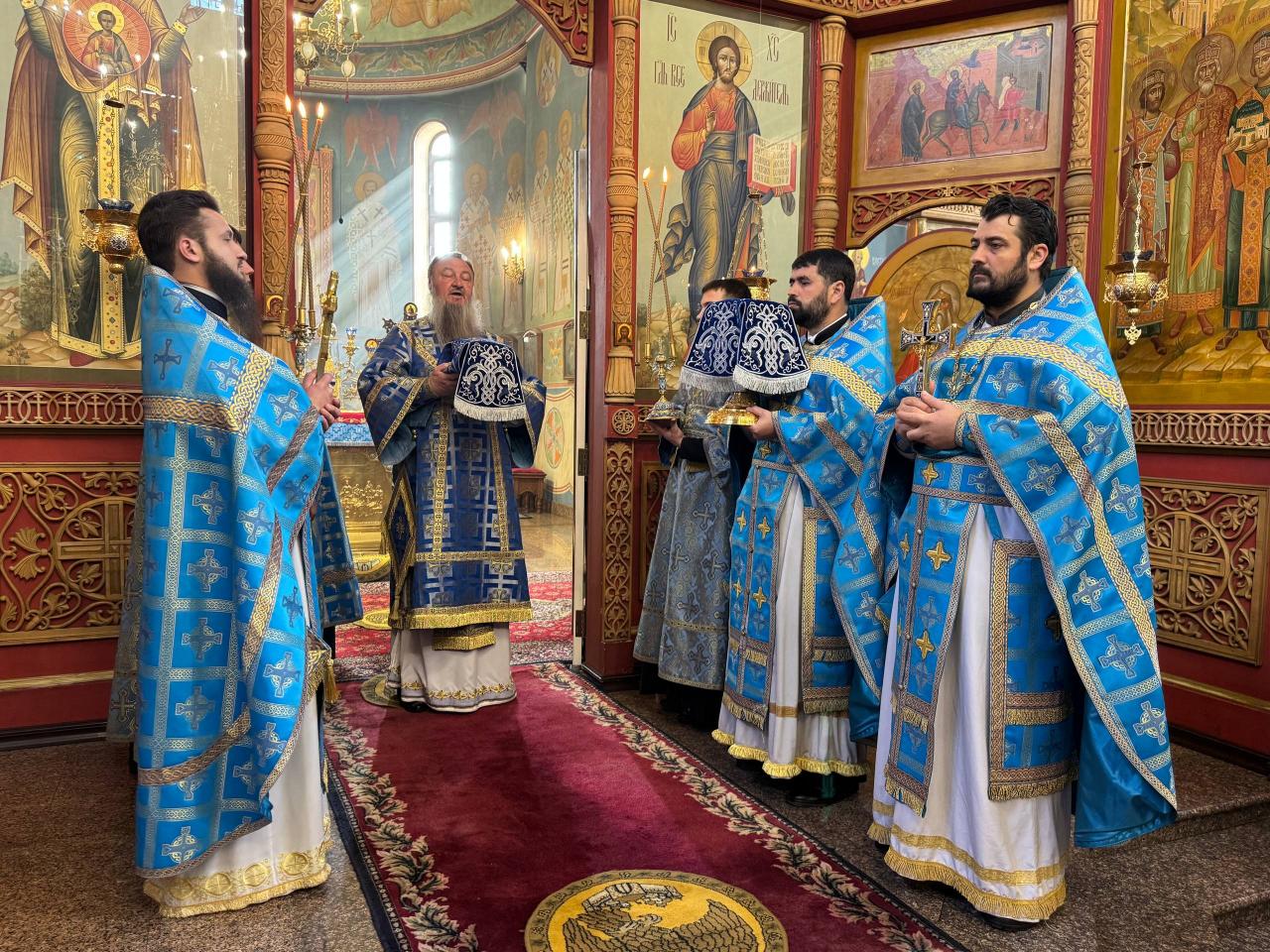 Его Высокопреосвященству сослужили ключарь и духовенство кафедрального собора. Согласно уставным указаниям, чтение Акафиста было разделено на четыре части, каждая из которых совершалась в облачениях различных цветов – синего, фиолетового, белого и вновь синего, что придавало богослужению особую торжественность и символическую выразительность.