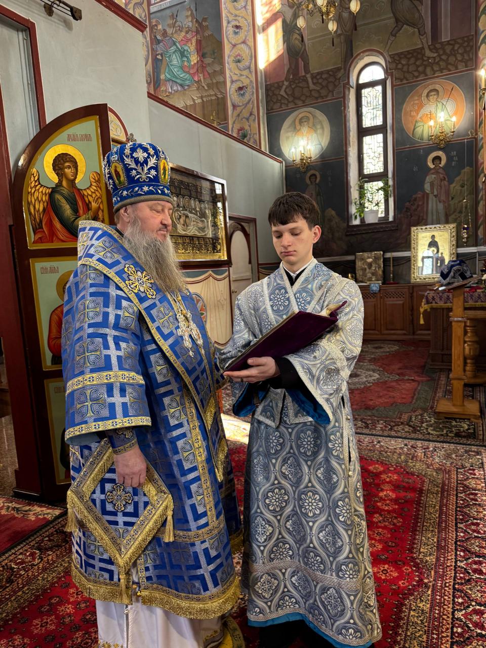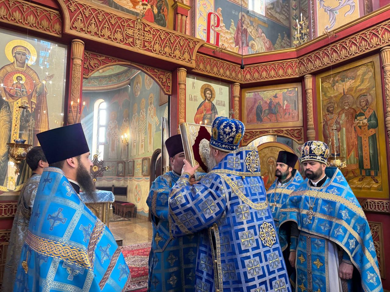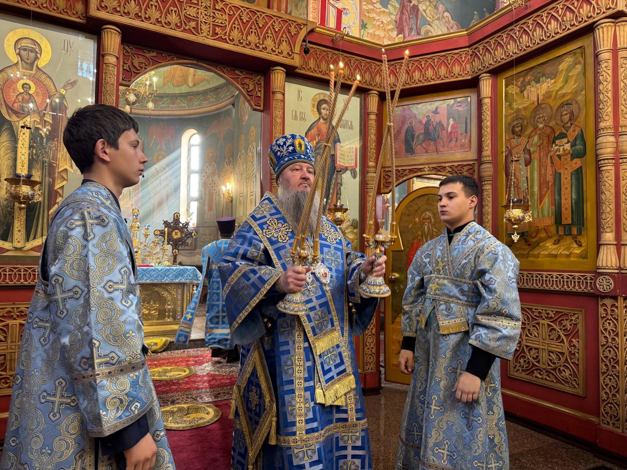 Его Высокопреосвященству сослужили ключарь и духовенство кафедрального собора. Согласно уставным указаниям, чтение Акафиста было разделено на четыре части, каждая из которых совершалась в облачениях различных цветов – синего, фиолетового, белого и вновь синего, что придавало богослужению особую торжественность и символическую выразительность.