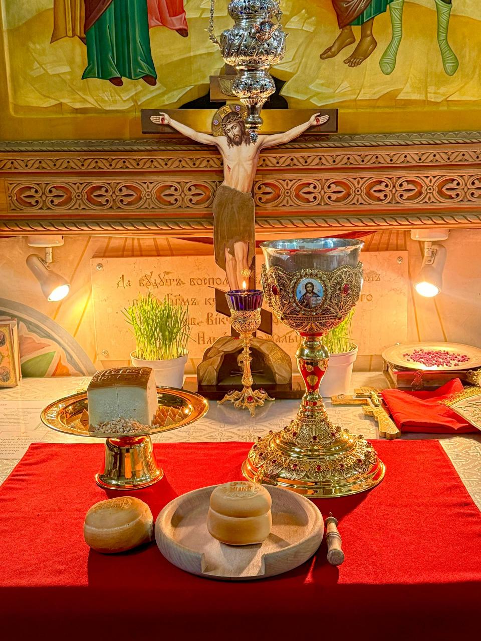 Богослужебной особенностью этого дня является произнесение в конце Литургии молитвы прп. Ефрема Сирина с тремя земными поклонами, после чего до праздника Святой Троицы преклонение колен в храме упраздняется (кроме земных поклонов перед Святой Плащаницей).