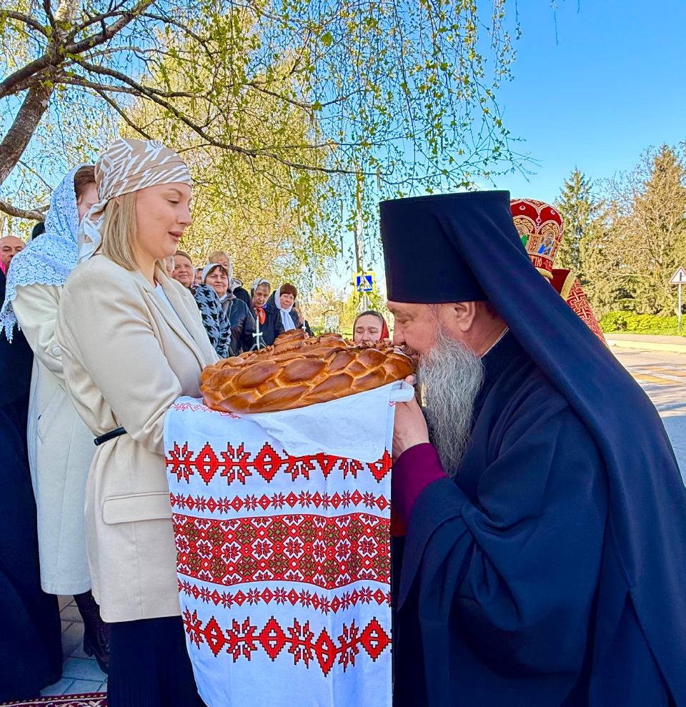 У входа в храм Высокопреосвященнейшего Владыку по древнему обычаю встретили хлебом-солью депутат Верховного Совета Олег Петрик, неустанно оказывающий содействие в деле созидания храма, благочинный округа и православные верующие, с радостью ожидавшие архипастырского визита.
