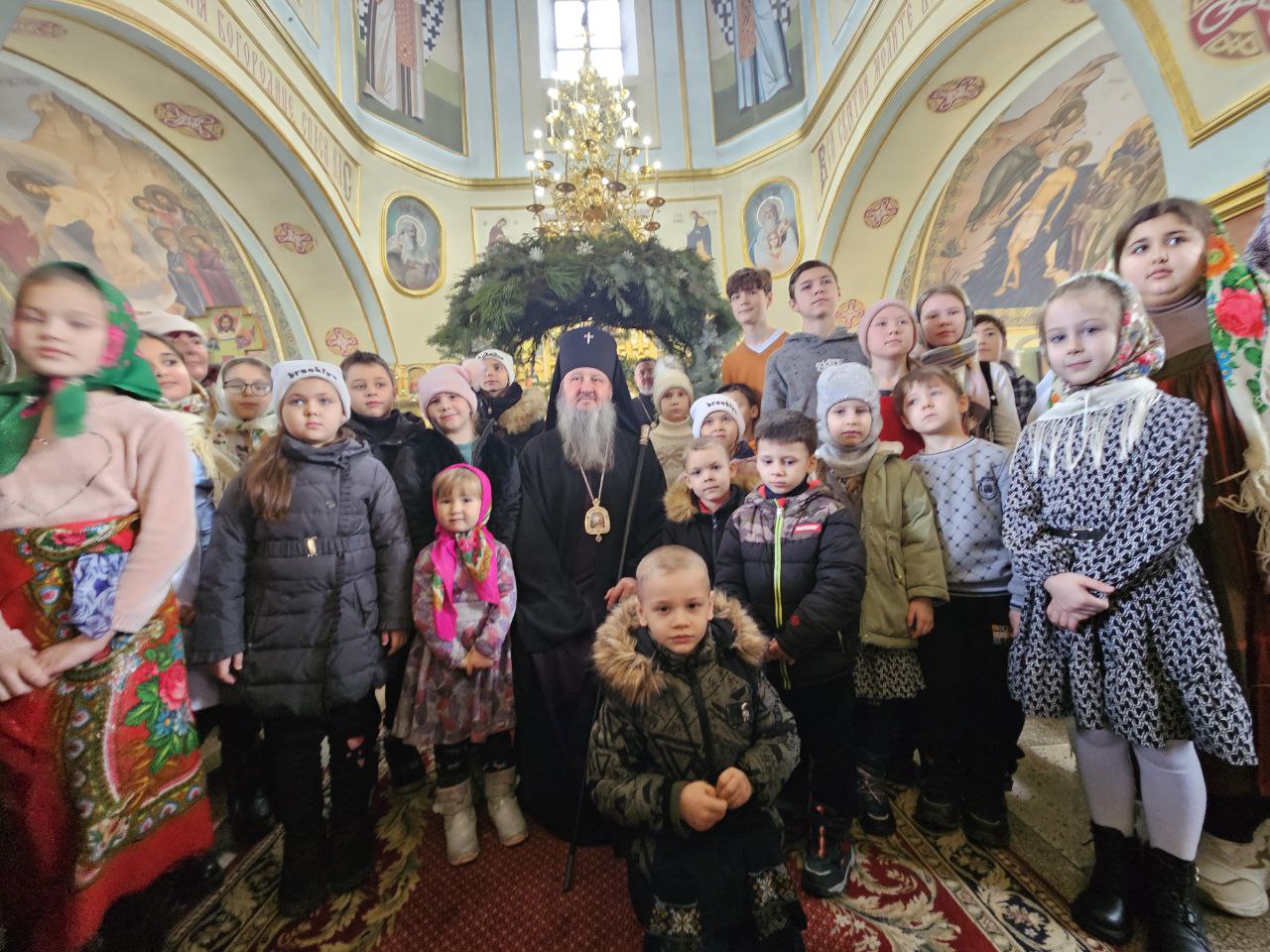После богослужения воспитанники воскресной школы и юные прихожане храма представили рождественское выступление, прославляя Родившегося в Вифлееме Спасителя стихами и песнопениями. Владыка обратился к детям со словами назидания и вручил каждому рождественский подарок.